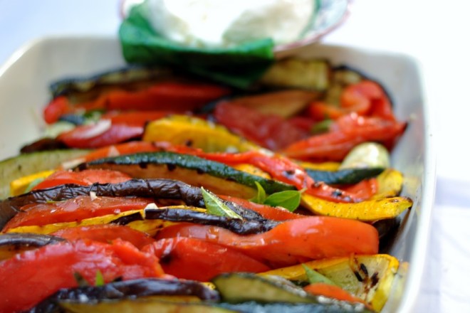Je dois vous avouer que cette recette sur le grill est une des mes préférées… vous pouvez la servir comme accompagnement ou comme un plat en soi, comme j’ai fait ici avec la merveilleuse mozzarella fraîche, la Burrata. elle accompagne votre grillade favorite et sert le lendemain pour préparer des délicieux sandwichs aux légumes grillés.