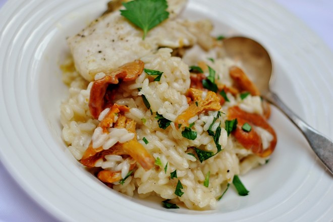 Je suis finalement arrivée à ma talle de chanterelles avant les limaces!!! (roulement de tambour, feux d’artifice, danse en transe… alléluia!) vous savez mon anniversaire c’est bientôt, le plus beau cadeau que vous pouvez m’offrir c’est une talle de chanterelles… Ceci-dit, je VOUS offre ma recette de risotto aux chanterelles. Si vous ne courez pas les bois régulièrement, vous pouvez en trouver dans les marchés publics.