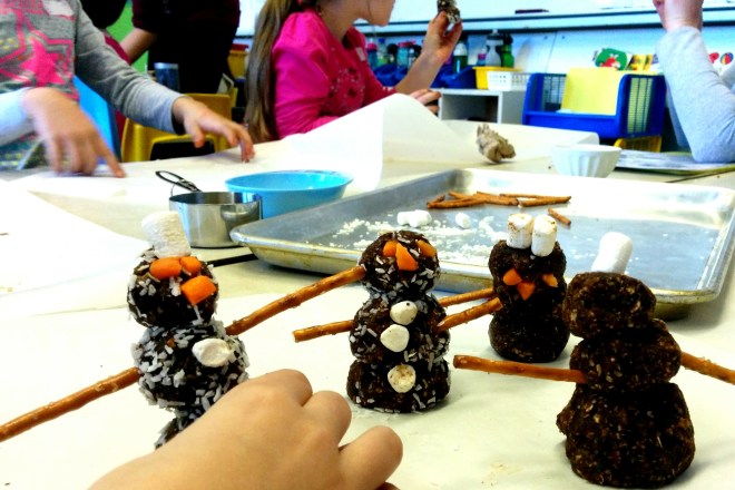 Hier, le cœur rempli, je donnais trois ateliers culinaires aux jeunes de l’école primaire l’Odyssée.💜 La recette du Bonhomme de Neige Santé fût un grand succès! Les élèves étaient merveilleux, curieux et attentifs. Je vous dis MERCI! J’ai donc créé une recette de boules d’énergie sans noix, sans produits laitiers qui donne des boules qui de travaillent très bien et avec lesquelles on peut faire des jolies créations, telles que Bonhommes de Neige, Robot Chocolat, Chenille Vanille et j’en passe!