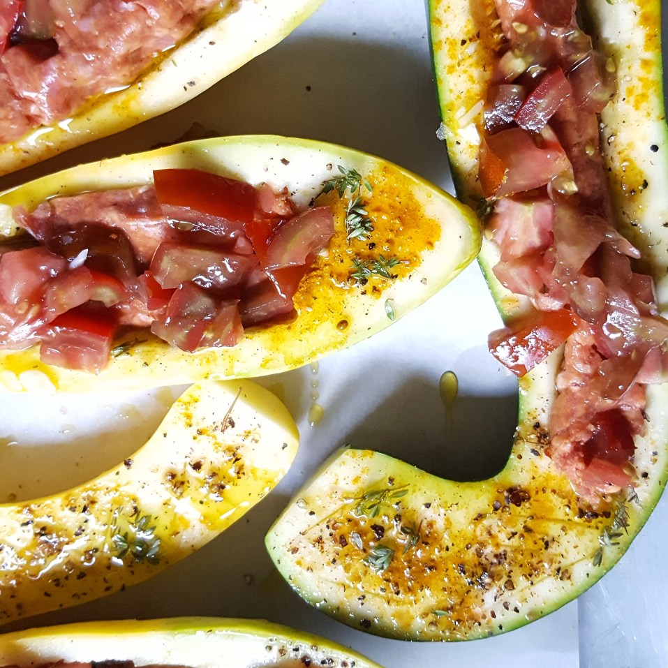 C’est l’abondance de courgettes, zucchinis et potirons au potager et au marché en ce moment!  C’est un légume facile à cultiver, économique, apprécié et souvent très prolifique.  Ne sachant plus quoi en faire, certains m’ont demandé ma recette favorite pour l’apprêter, allô amis Instagram! 🙂   J’aurais pu vous présenter un gâteau aux zucchinis, une crêpe ou potage mais j’ai opté pour la préférée de la famille et oh! combien populaire ici, car elle peut varier selon l’humeur: la courgette farcie et gratinée.   J’utilise la chair de saucisse achetée chez mon boucher (Salut Fred!) ou toute autre viande hachée assaisonnée, le fromage que j’ai à la maison et les aromates tels que pesto ou herbes du jardin.  Autrement dit, elle est facile à modifier selon vos envies et le contenu de votre frigo!