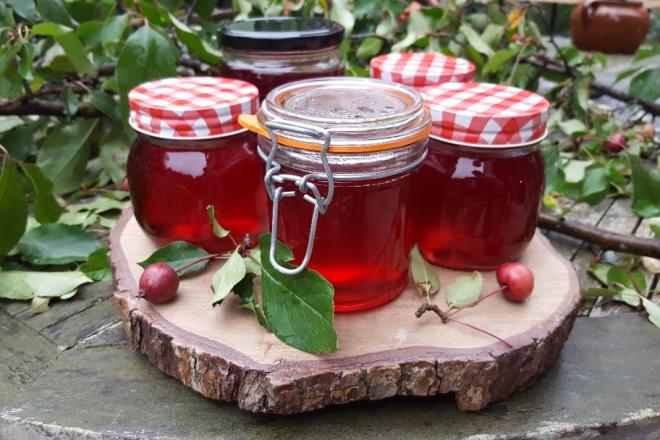 J’ai aperçu des employées de ma ville tailler un joli pommier et puisqu’elles allaient disposer de ces belles branches de pommettes je les ai sauvées et mises en pot! Un soir de semaine… Conclusion: la gelée de pommettes est facile à réaliser et la conserve a un grand taux de réussite. Bien évidement j’ai consulté quelques recettes de gelées pour les simplifier, épurer et après dégustation (fermeté, couleur, goût, texture, facilité d’exécution) je suis ravie de vous partager cette version. Depuis, je vois des pommettes partout!
