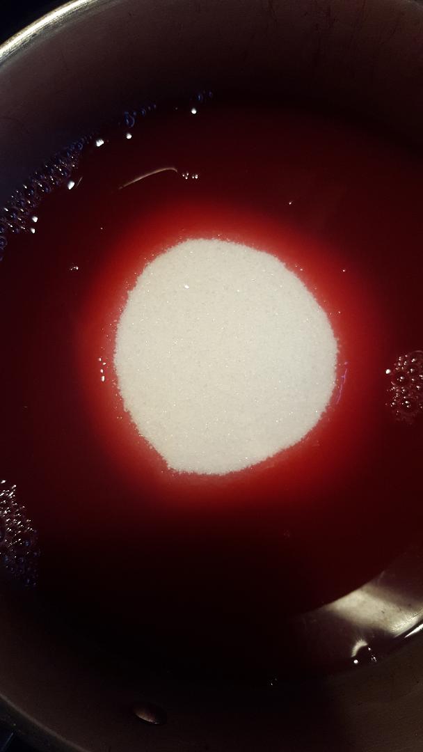 - quand le liquide ne coule plus, le mesurer et préparer la même quantité de sucre en terme de volume (exemple: 2 tasses de liquide de pommettes = 2 tasses de sucre)